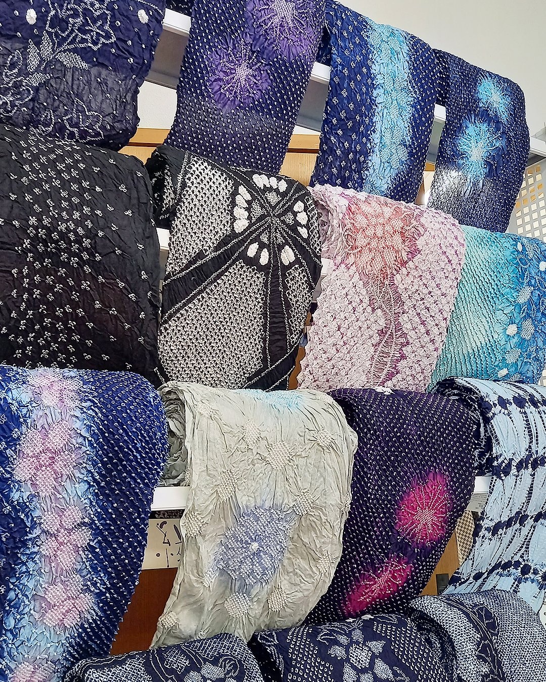 京都きもの町でお取り扱いのある「絞り浴衣」反物を並べております。お気に入りの1柄をお選びください。