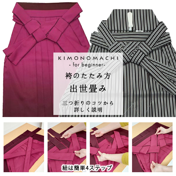 昔は男袴は出世畳み、女袴は石畳みと区別があったようですが、現在は女袴も出世畳みの場合が多く、きもの町商品もすべて出世畳みとなっています。