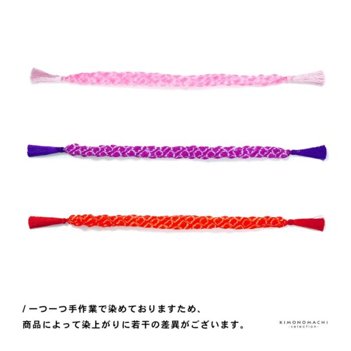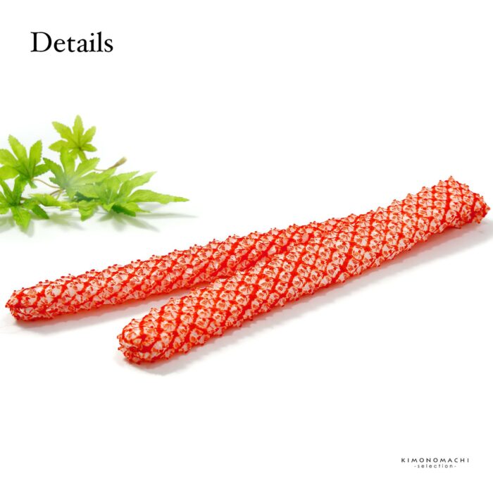 かのこは、後ろの髷(まげ:おだんご部分)の根元につけるものです。日本髪の髷につける布は髷掛けや手絡といった名称で呼ばれ、髷の種類によっていろいろな素材や色柄がありますが、少女の髪型には可愛らしい鹿の子絞りの布を使うのが定番となっています。かのこも長い紐状ですが、髷につけるときはあらかじめ結び目を形作ってから固定します。