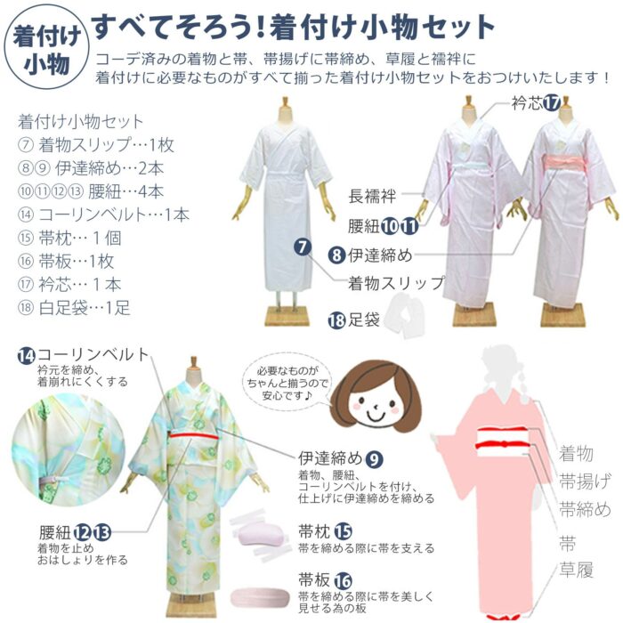 上記の5までは着付け用品やインナー類です。別途、着付けクリップやコーリンベルトがあると便利です。