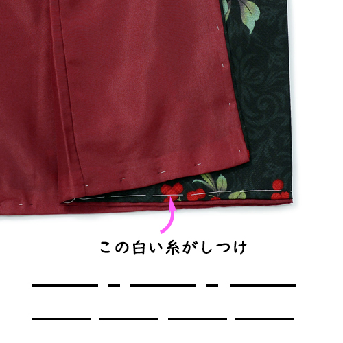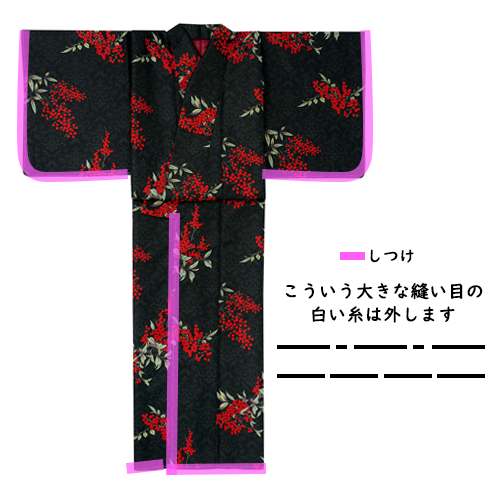 これは、できあがった着物の縫い代や裏地の折り目が型崩れしないようにするためのもので、着用時に外してしまいます。図のピンクで示した部分をチェックして、長い白糸があれば切ってください。