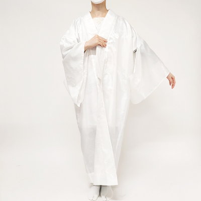 着方としてはガウンのように前で重ねて紐類で結んでいくだけ。特徴としては、身頃はすべて左が上になるように重ねます。長い着物を腰の位置で折り返すので、その部分だけ分かりにくいかもしれませんが、構造はすごくシンプルです。
