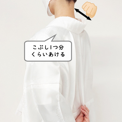 長襦袢は衿の後ろを少しあけ、右が下、左が上になるよう衿を合わせます。