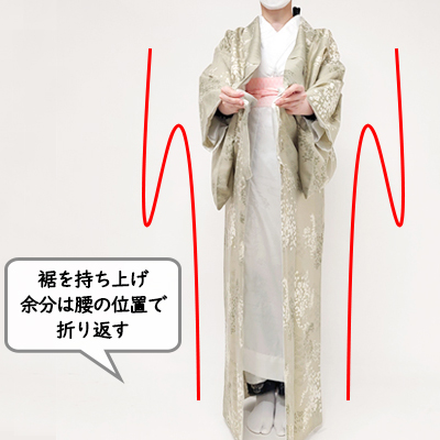 着物は身長と同じくらいの長さがあるのが標準です。なので裾が床につきます。 - 裾を上げます。長い分は腰の位置で折り返し、たくし上げている状態です。