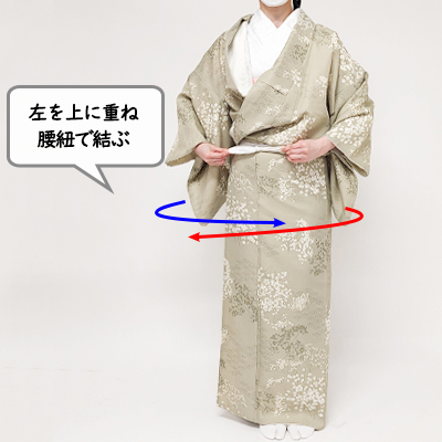 - 右が下、左が上になるよう巻き付け、腰紐で結んで固定します。