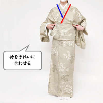 - 衿元をきれいに合わせます。左が上になるよう重ねます。