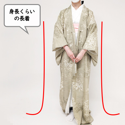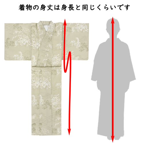着物の身頃の長さは、着用者の身長とほぼ同じです。時折「長すぎて着られません」といったお問い合わせがあります。ですが、構造でご説明した通り、腰の位置で折り上げおはしょりを作って着るので、長くてOKです。