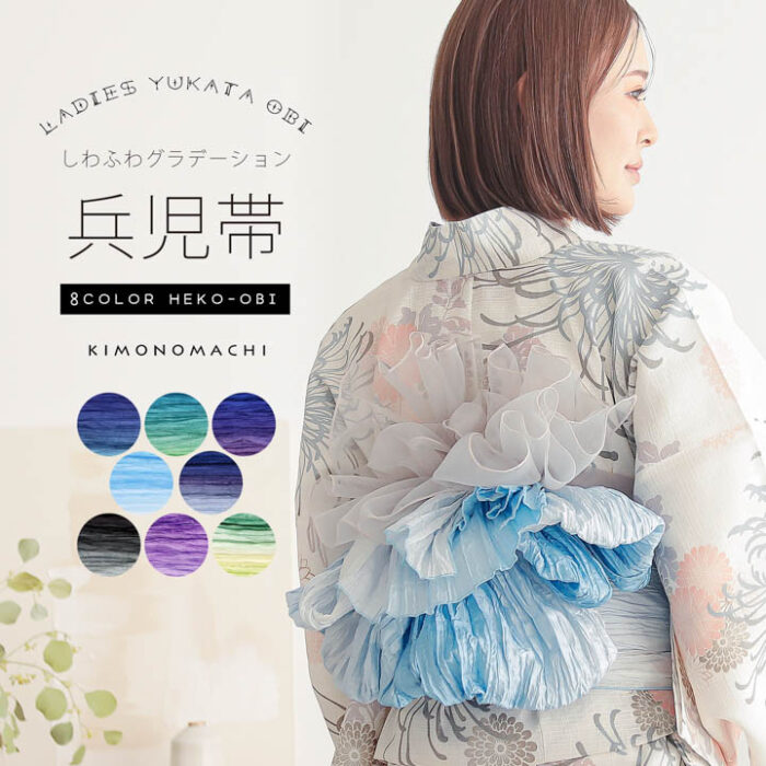 2色ぼかしが特徴的で、スタッフこだわりの色の組み合わせがとってもおしゃれ。濁りのない美しい発色が自慢。浴衣を今っぽい仕上がりにしてくれる、新しいしわふわ兵児帯です。