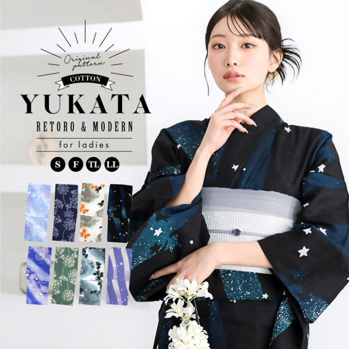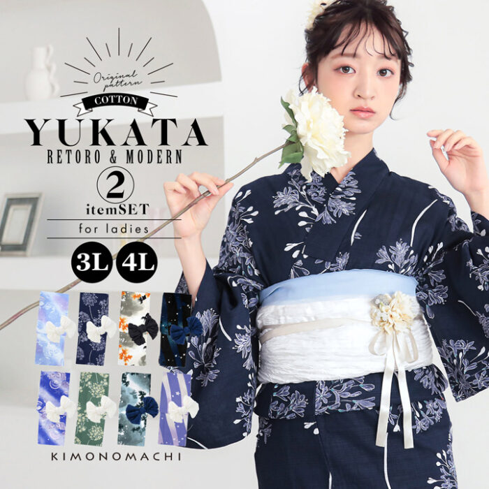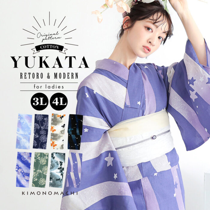 素材は綿100%。通常の浴衣に加え、セパレート浴衣(二部式浴衣)にも力を入れており、どちらのタイプの浴衣も豊富なサイズ展開でご用意しおります。