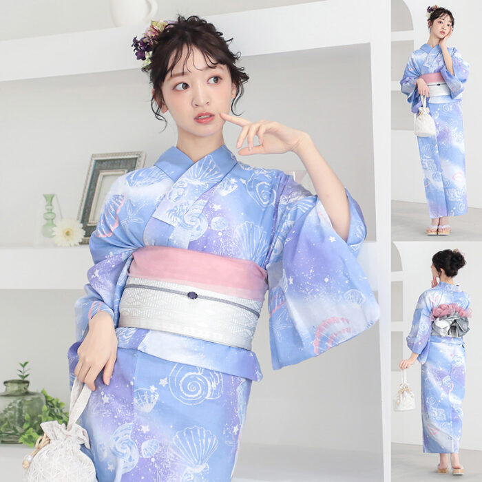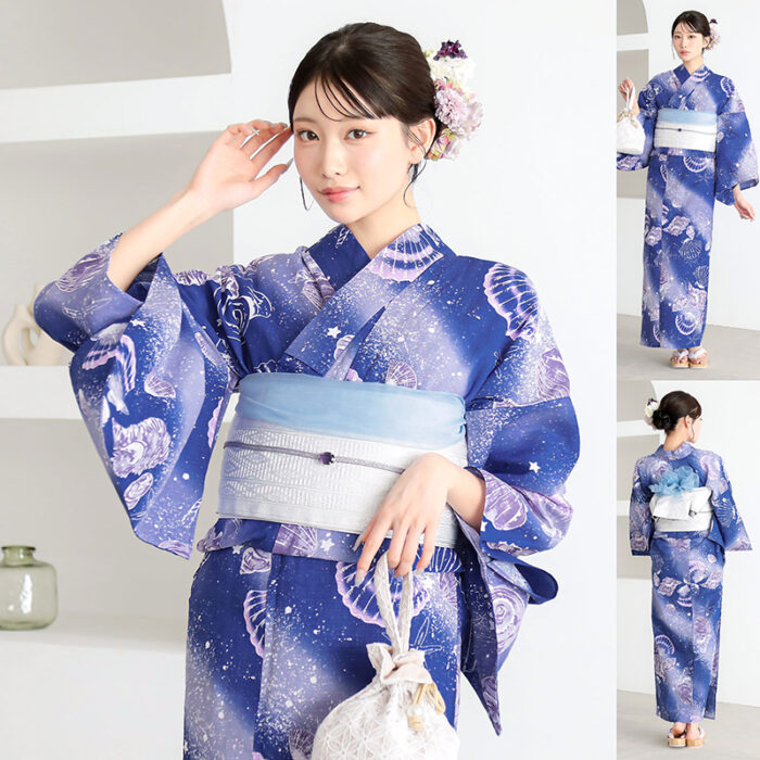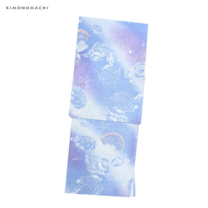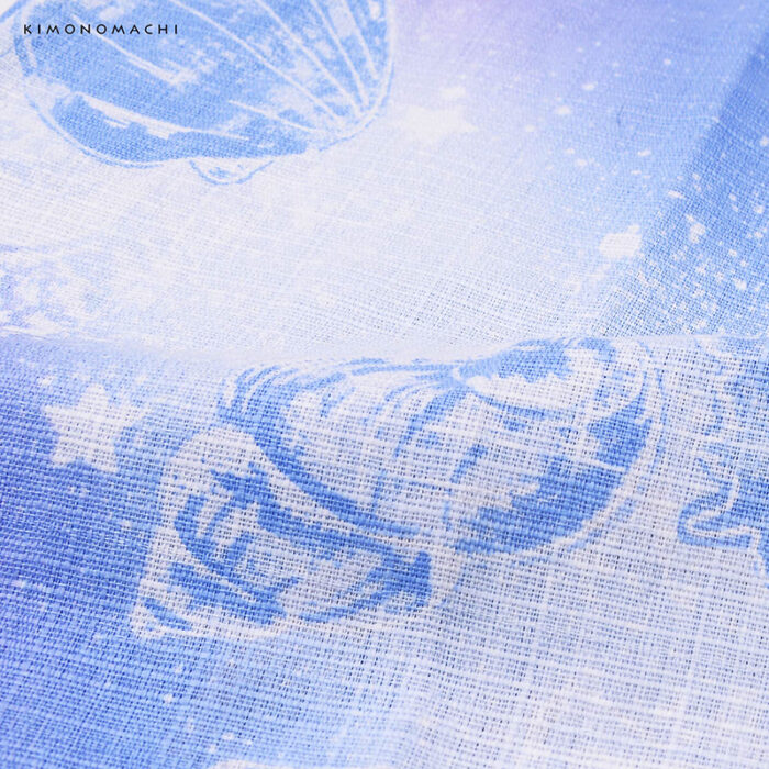 こちらは夜の海です。夜空のような深い青紫に、浮遊感のある配置の貝殻が星座のように散らばっている幻想的な雰囲気の浴衣です。