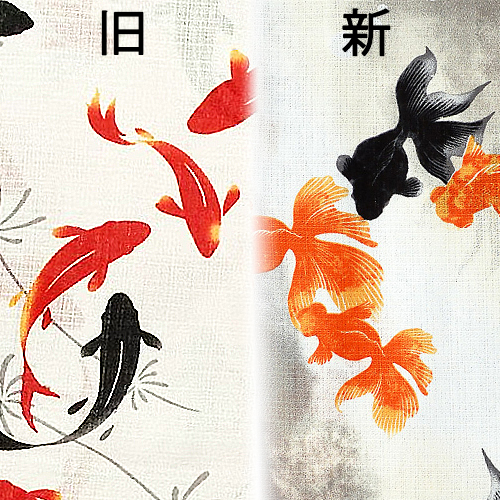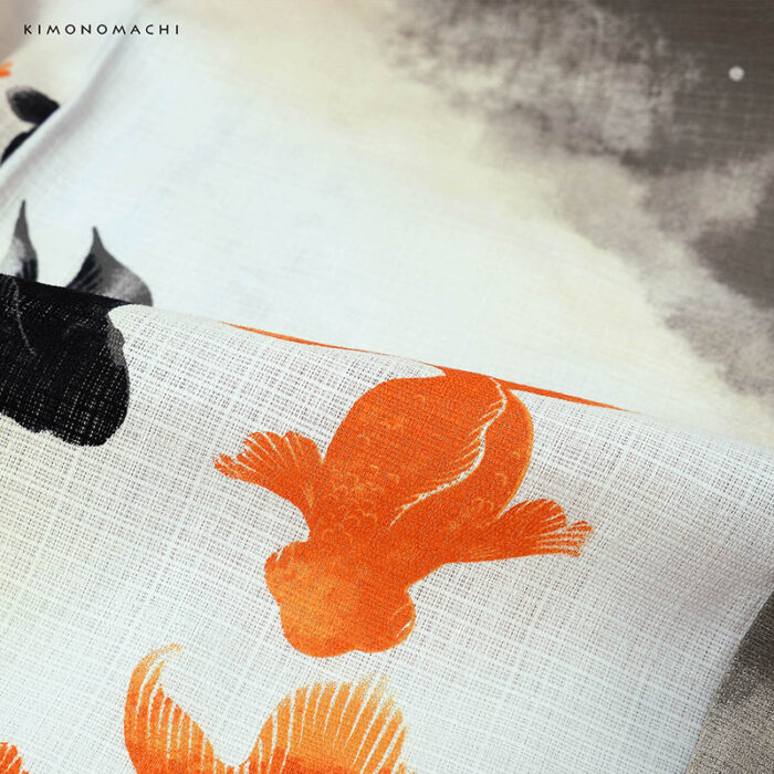 生成り色と薄墨色の水彩調のぼかしの地に白のあぶく。朱色と黒の出目金がゆらゆらと泳いでいる姿を上から眺めているかのようなデザインです。