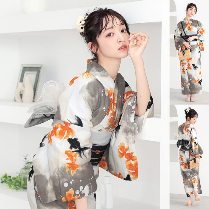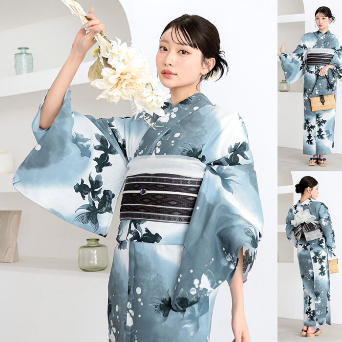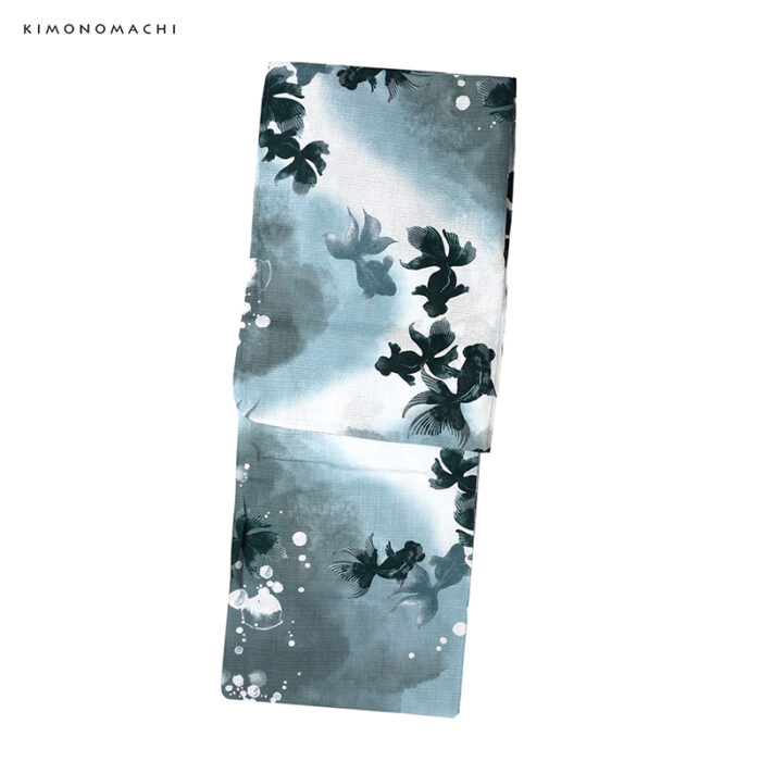 金魚らしい朱と黒の配色が古典的でかわいい!よく見るとちゃんと目や鱗が表現されており、生き生きとした存在感があります。薄墨色のぼかしが大人っぽく、透明感のある白い泡まで表現された繊細な美しさのある浴衣です。