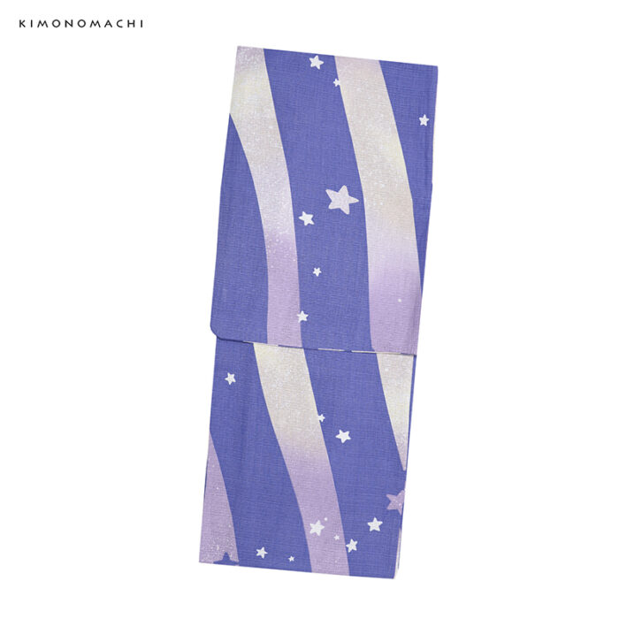 灰みの青藤色の地に天の川のようなよろけた太いストライプ、手描き調の星。ストライプの中はミスティな薄紫のグラデーションに白い星々、星雲のようなほのかな黄色の挿し色。