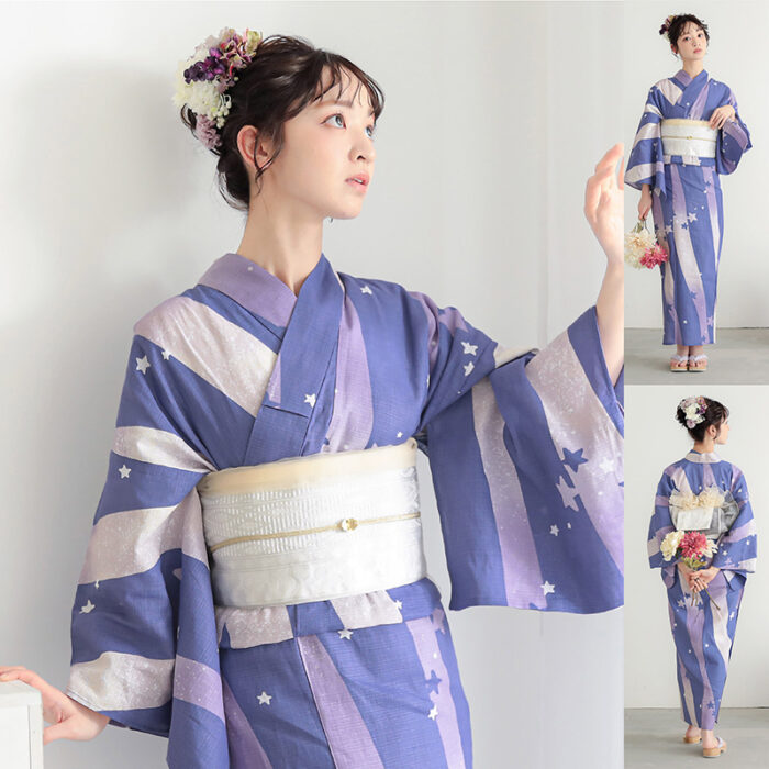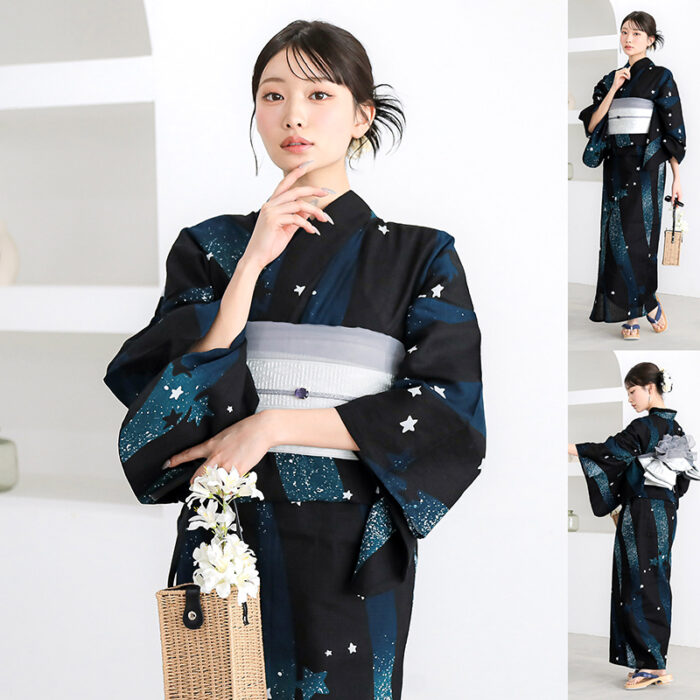 全体的にはグレイッシュな浅いトーンなので大人っぽくも見せることができますが、黄色のぼかしがゆめかわな少女っぽさも感じさせます。星のロマンチックなイメージを表現した浴衣です。