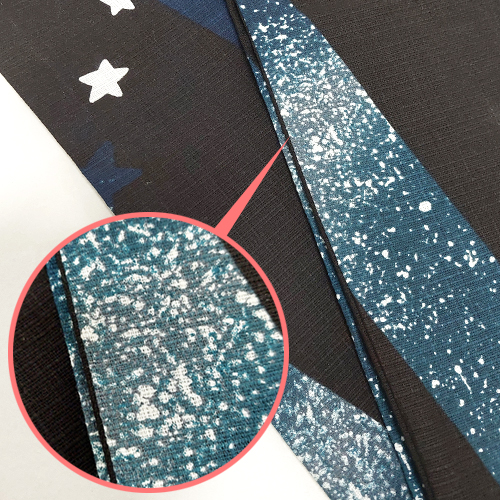 漆黒の地に天の川のようなよろけた太いストライプ、手描き調の星。ストライプの中は暗めの深い青緑のグラデーションに白い星々、星雲のようなほのかに赤い挿し色。