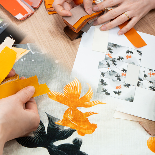 それを形にするため、スタッフ自身の思い出や「こんなデザインを作りたい!」というアイディアを出し合いました。強い思いを形にするために、下絵をデザイナー自ら描いたものも。最終的に京都の図案家さんの手によって仕上げられ、個性豊かでストーリーを感じさせる魅力的なデザインが誕生しました。