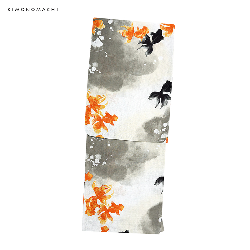生成り色と薄墨色の水彩調のぼかしの地に白のあぶく。朱色と黒の出目金がゆらゆらと泳いでいる姿を上から眺めているかのようなデザインです。