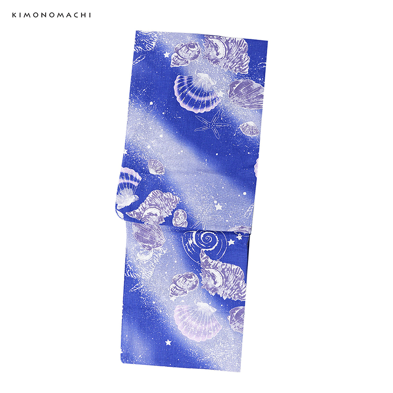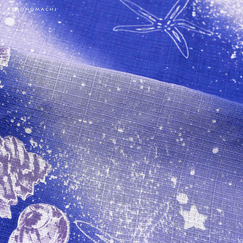 こちらは夜の海です。夜空のような深い青紫に、浮遊感のある配置の貝殻が星座のように散らばっている幻想的な雰囲気の浴衣です。