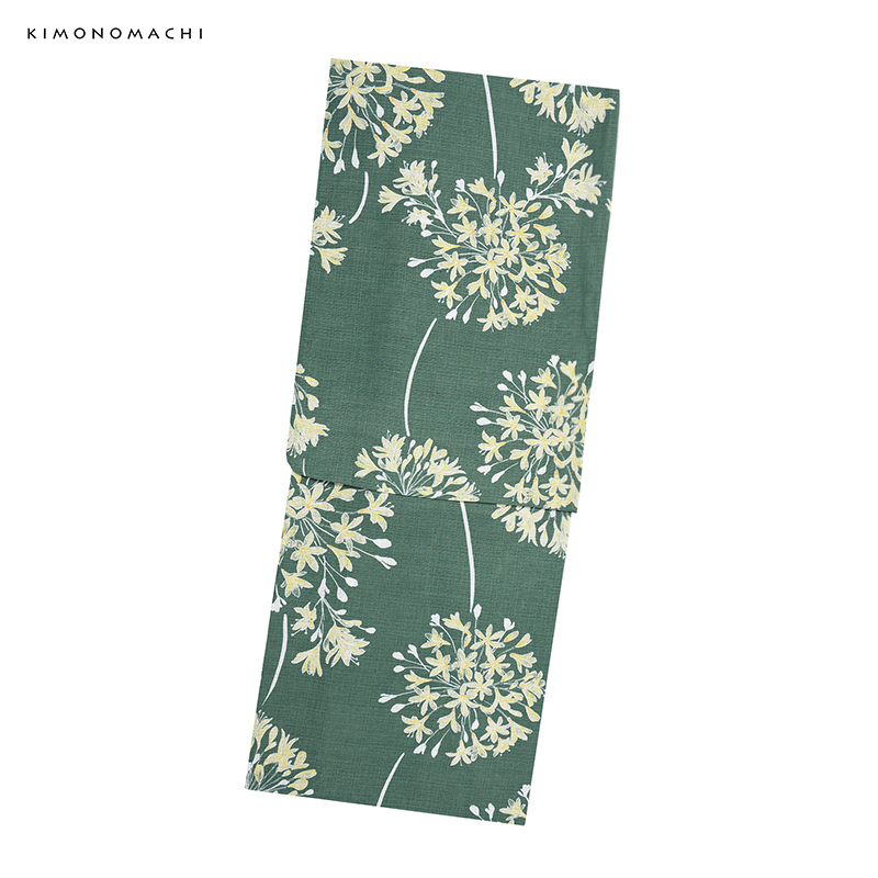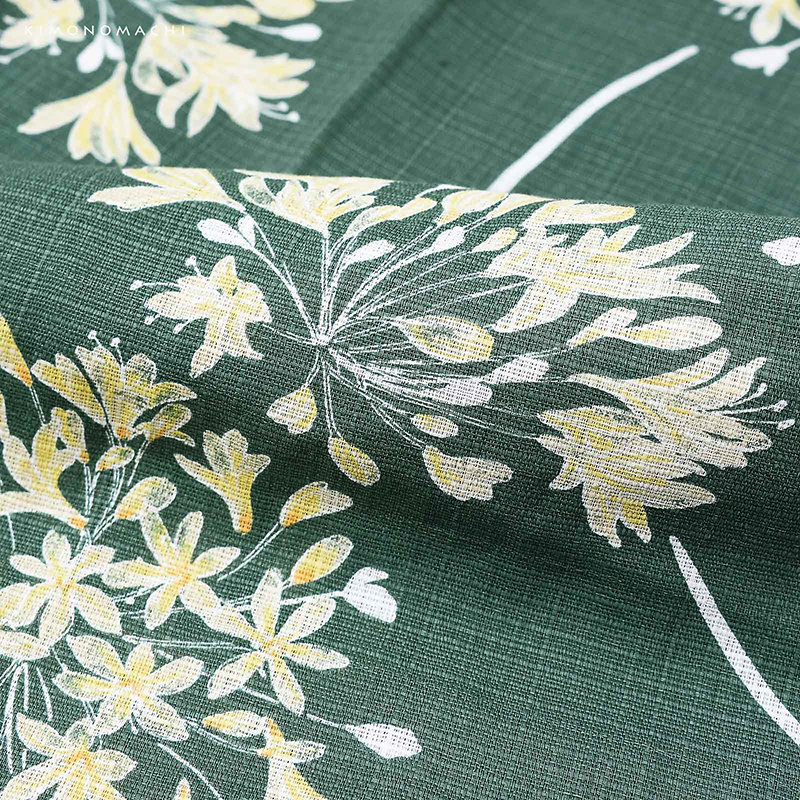 アガパンサスには白花の種類もあります。こちらも透明感の表現にこだわり優し気な雰囲気に。地の緑は肌なじみの良い発色となるよう考慮しています。大人っぽくも可愛らしくも着られる万能柄です。