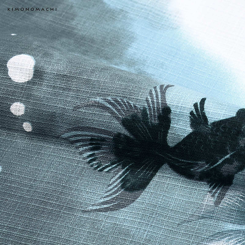 金魚らしい朱と黒の配色が古典的でかわいい!よく見るとちゃんと目や鱗が表現されており、生き生きとした存在感があります。薄墨色のぼかしが大人っぽく、透明感のある白い泡まで表現された繊細な美しさのある浴衣です。