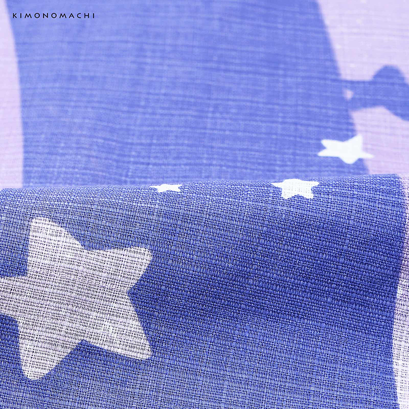灰みの青藤色の地に天の川のようなよろけた太いストライプ、手描き調の星。ストライプの中はミスティな薄紫のグラデーションに白い星々、星雲のようなほのかな黄色の挿し色。