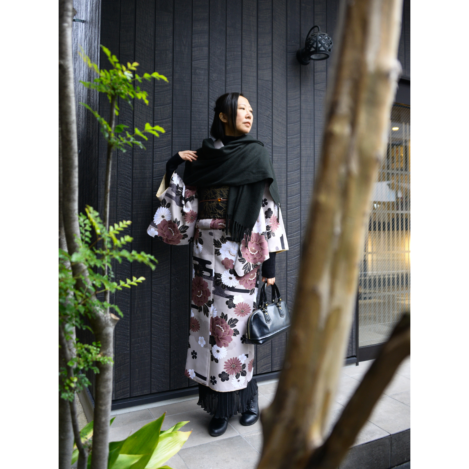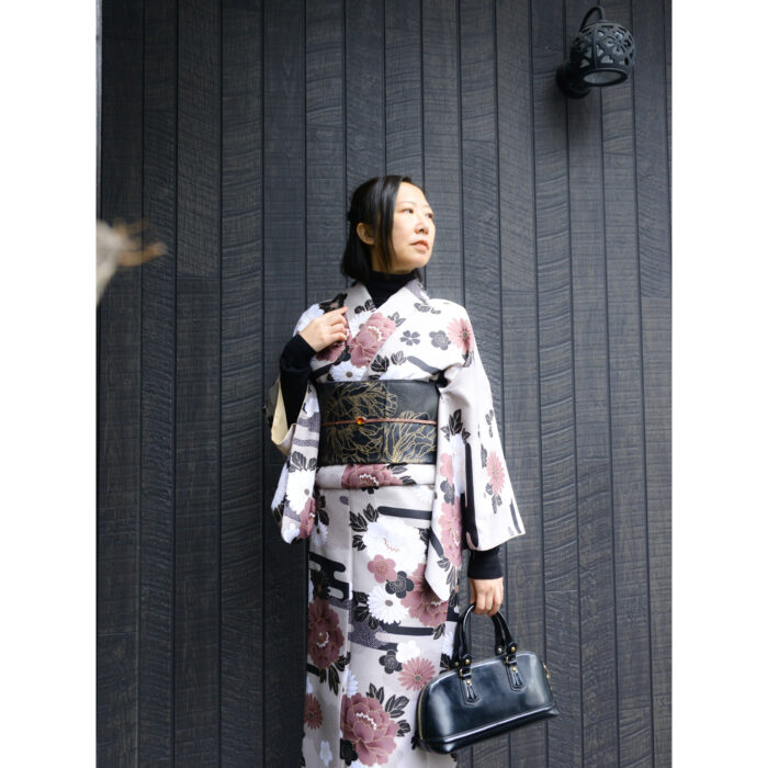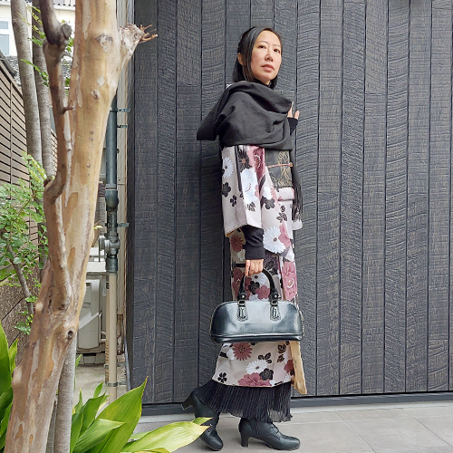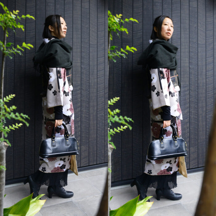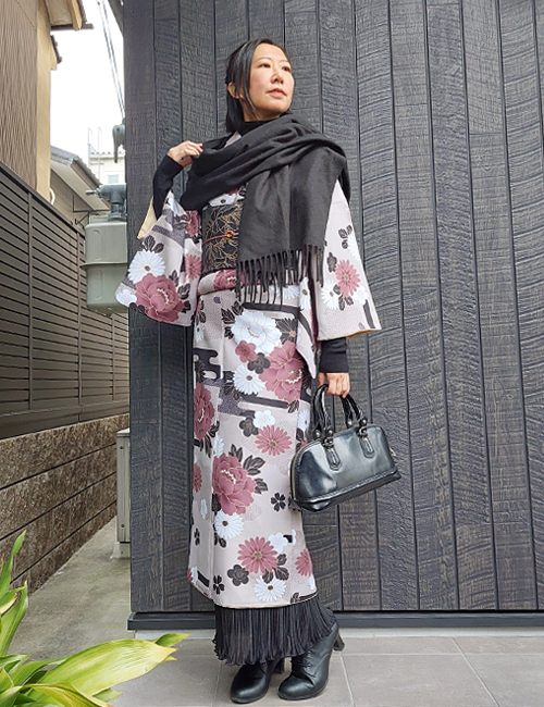 立春を過ぎましたが、京都では雪が降ったり、急に温かくなったりしています。今回は不安定な気候でもパパっと着物を楽しめる和洋ミックスコーデをご紹介いたします。